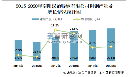 2015-2020年南阳汉冶特钢有限公司粗钢产量及增长情况统计图