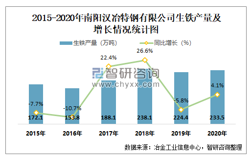 2015-2020年南阳汉冶特钢有限公司生铁产量及增长情况统计图