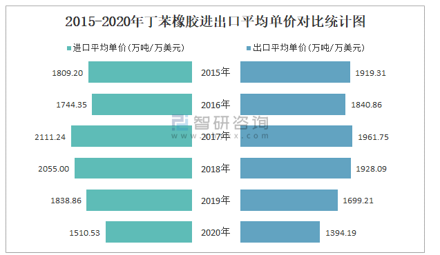 2015-2020年丁苯橡胶进出口平均单价对比统计图