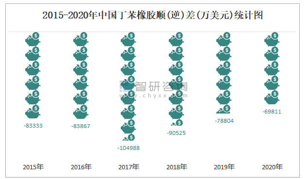 2015-2020年中国丁苯橡胶顺(逆)差(万美元)统计图