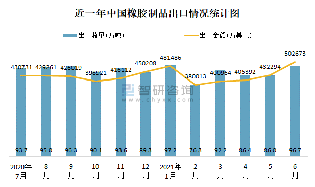 根据中国石油和化学工业联合会数据显示:2021年6月中国橡胶制品进口数量为7万吨,进口金额为101020万美元;2021年6月橡胶制品出口数量为96.7万吨,出口金额为502673万美元;近一年中国橡胶制品出口总金额大于进口总金额,贸易顺差为主,6月出口均价5198.3美元/吨。