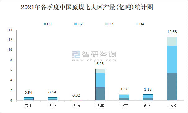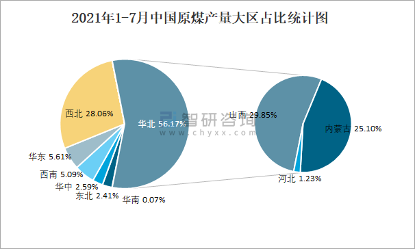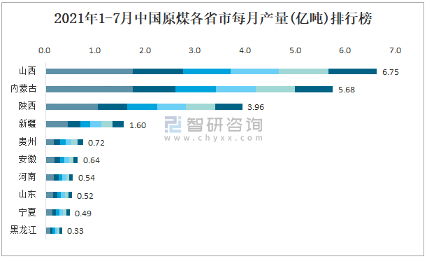 根据国家统计局数据显示:2021年各季度(第三季度暂只统计7月数据)中国原煤主要集中在华北、西北、华东地区生产;2021年1-7月中国原煤产量大区分布不均衡,其中华北地区产量最高,特别是山西省贡献了最多产量;2021年1-7月中国原煤各省市产量呈现梯队式分布,山西、内蒙古、陕西等省产量排名前三。