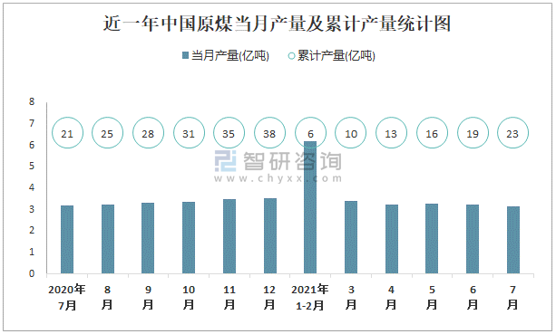 根据国家统计局数据显示:2021年7月中国原煤产量为3.1亿吨,同比下降3.3%;2021年1-7月中国原煤累计产量为22.6亿吨,累计增长4.9%;2015-2020年中国原煤产量2016年跌至最低,此后逐年递增。