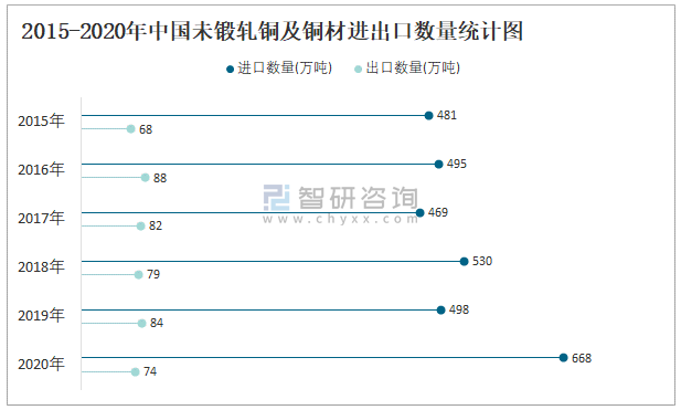 2015-2020年中国未锻轧铜及铜材进出口数量统计图