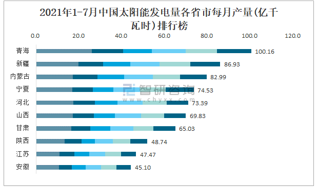2021年1-7月中国太阳能发电量各省市每月产量排行榜