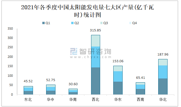 2021年各季度中国太阳能发电量七大区产量统计图