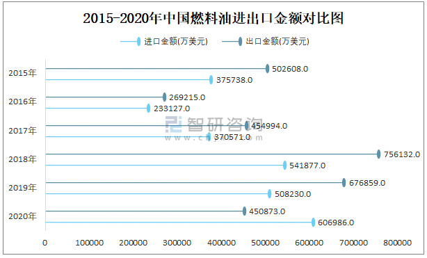 根据中国石油和化学工业联合会数据显示:2015-2020年中国燃料油进口数量与进口金额均在2018年达到最大值;出口数量与出口金额总体均呈上升趋势。
