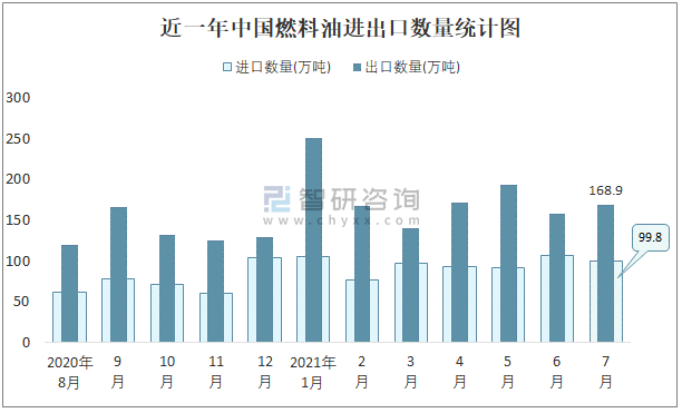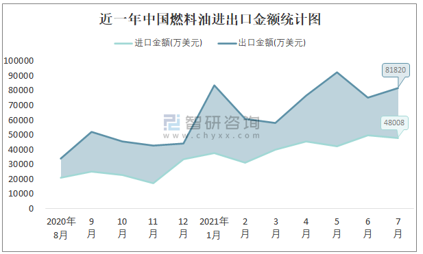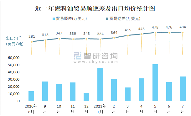 根据中国石油和化学工业联合会数据显示:2021年7月中国燃料油进口数量为99.8万吨,出口数量为168.9万吨;进口金额为48008万美元,出口金额为81820万美元;近一年中国燃料油出口总金额大于进口总金额,贸易顺差为主,7月出口均价484.4美元/吨。