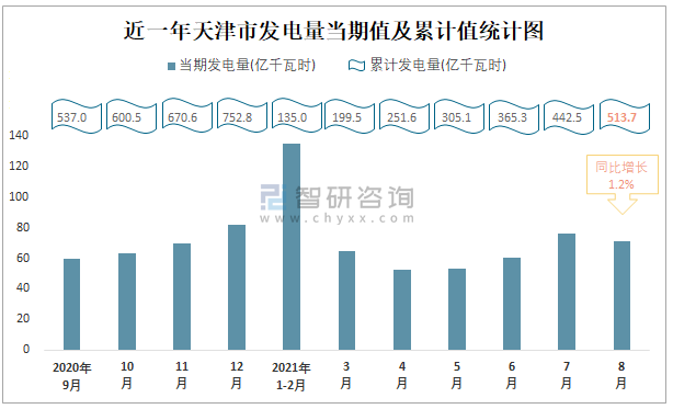 近一年天津市发电量当期值及累计值统计图