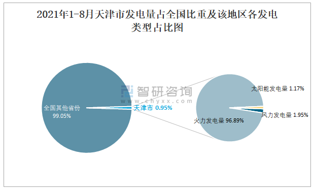 2021年1-8月天津市发电量占全国比重及该地区各发电类型占比图