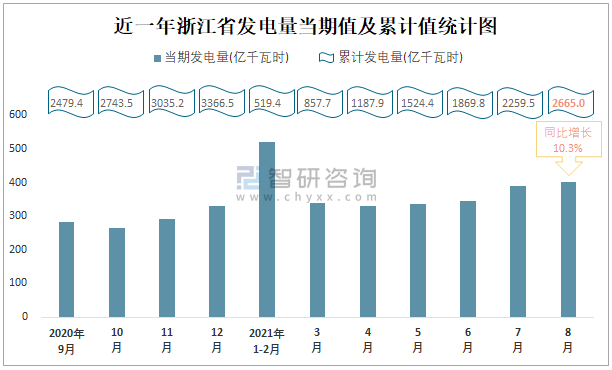 根据国家统计局数据统计可知:2021年8月浙江省发电量为401.6亿千瓦时,同比增长10.3%,2021年1-8月浙江省发电量为2665亿千瓦时,累计增长21.3%;2021年1-8月浙江省主要有5种类型发电量,发电量占全国比重约为4.94%,其中火力发电量为2012.7亿千瓦时,占浙江省发电量比重约为75.52%,占全国发电量比重约为3.73%,是浙江省最大发电量类型。