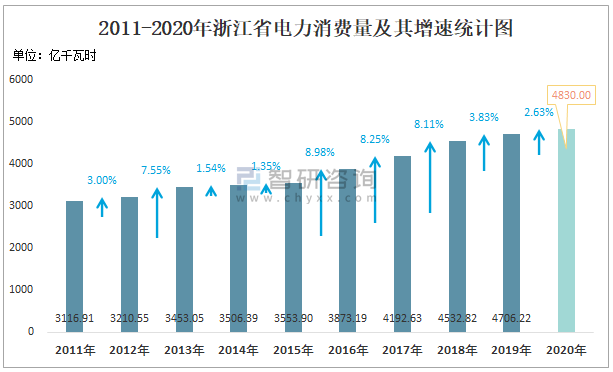 根据国家统计局数据统计可知:2011-2020年浙江省发电量有所波动,总体呈现上升趋势,从发电量类型来看,火力发电量占比最大(2020年占比为72.13%),且近10年有所波动,总体呈现下降趋势;2011-2020年浙江省电力消费量(实物量)逐年递增,2015年-2016年之间增幅最大,为8.98%,2020年浙江省电力消费量(实物量)达到4830亿千瓦时。