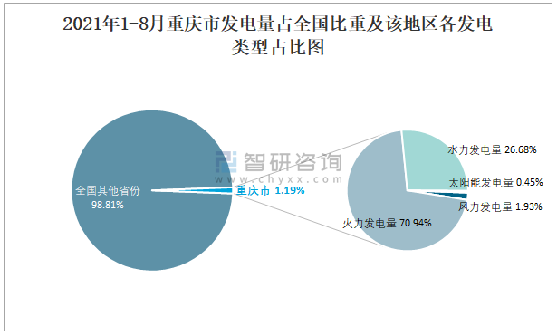 2021年1-8月重庆市发电量占全国比重及该地区各发电类型占比图