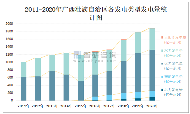 2011-2020年广西壮族自治区各发电类型发电量统计图
