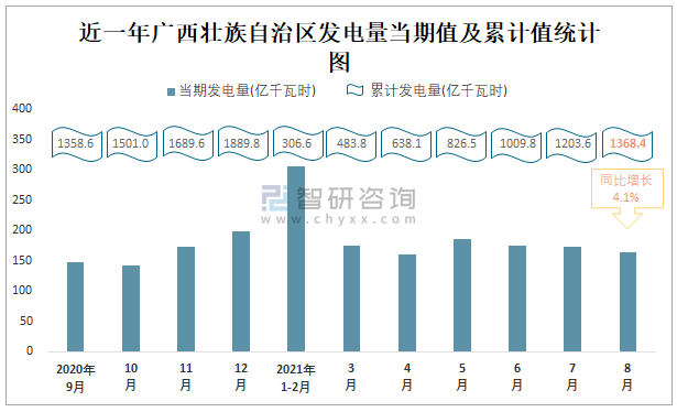 近一年广西壮族自治区发电量当期值及累计值统计图