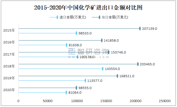 2015-2020年中国化学矿进出口金额对比统计图
