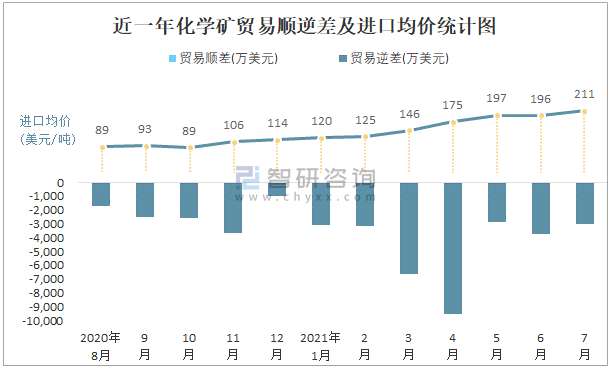 近一年化学矿贸易顺逆差及进口均价统计图