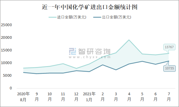 根据中国石油和化学工业联合会数据显示:2021年7月中国化学矿进口数量为65.3万吨,出口数量为44.5万吨;进口金额为13767万美元,出口金额为10735万美元;近一年中国化学矿出口总金额小于进口总金额,贸易逆差为主,7月进口均价210.8美元/吨。