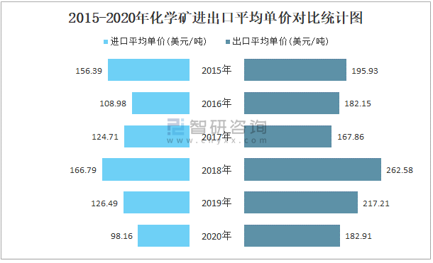 2015-2020年化学矿进出口平均单价对比统计图