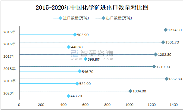 2015-2020年中国化学矿进出口数量对比统计图