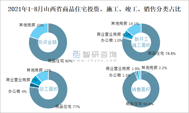 2021年1-8月山西省商品住宅投资、施工、竣工、销售分类占比