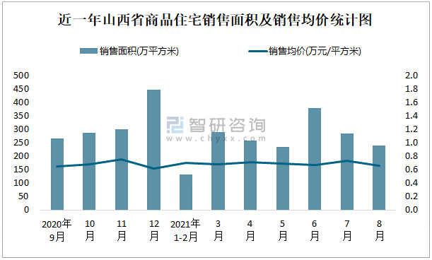 近一年山西省商品住宅销售面积及销售均价统计图