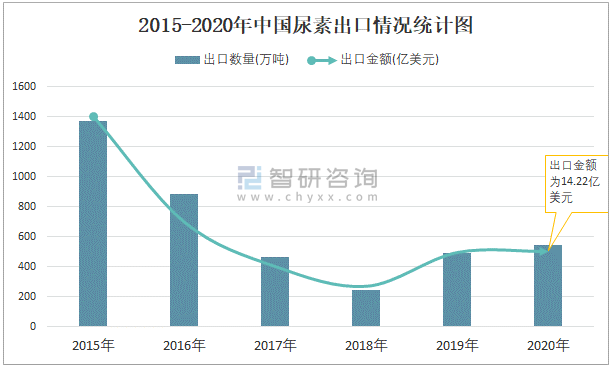 2015-2020年中国尿素出口情况统计图