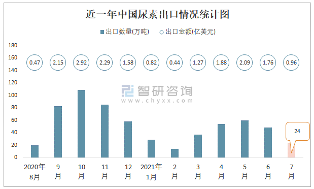 根据中国海关数据显示:2021年7月中国尿素出口数量为24万吨,同比增长34.1%,出口金额为0.96亿美元,同比增长118.1%;2021年1-7月中国尿素,出口数量为267万吨,出口金额为9.22亿美元。