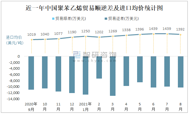 近一年中国聚苯乙烯顺逆差及进口均价统计图