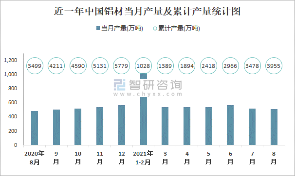 近一年中国铝材当月产量及累计产量统计图