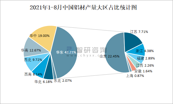 2021年1-8月中国铝材产量大区占比统计图