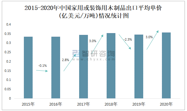 2015-2020年中国家用或装饰用木制品出口平均单价(亿美元/万吨)情况统计图