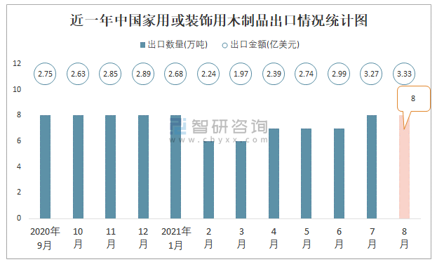根据中国海关数据显示:2021年8月中国家用或装饰用木制品出口数量为8万吨,同比增长9.3%,出口金额为3.33亿美元,同比增长29.8%;2021年1-8月中国家用或装饰用木制品出口数量为56万吨,出口金额为21.61亿美元。