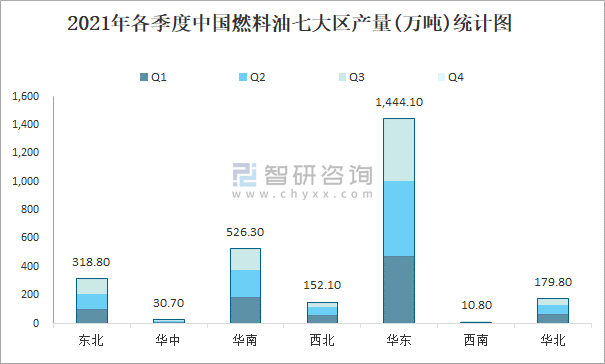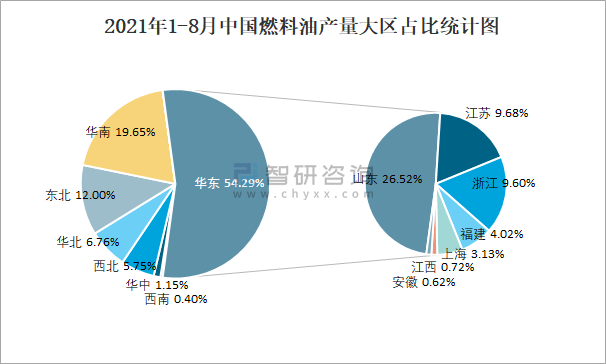 根据国家统计局数据显示:2021年各季度(第三季度目前暂只统计7月和8月数据)中国燃料油主要集中在华东、华南、东北地区生产;2021年1-8月中国燃料油产量大区分布不均衡,其中华东地区产量最高,特别是山东省贡献了最多产量;2021年1-8月中国燃料油各省市产量top1领先于其他前9名。
