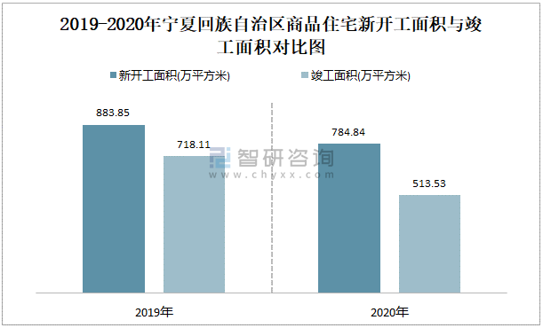 2019-2020年宁夏回族自治区商品住宅新开工面积与竣工面积对比图