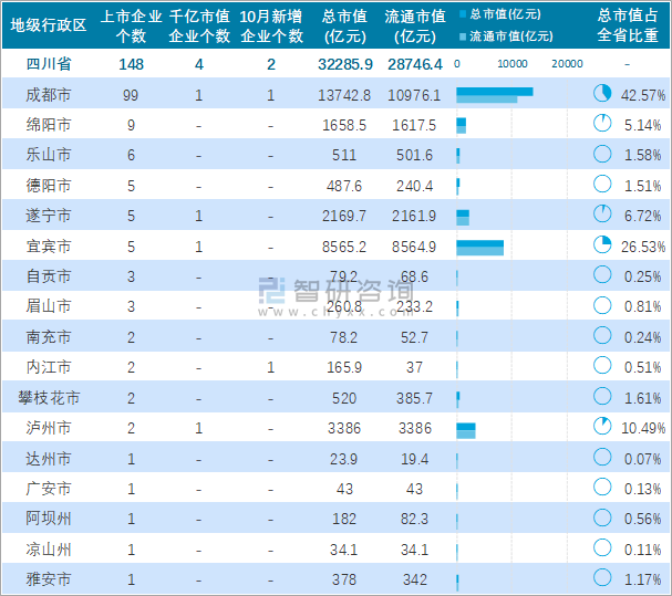 2021年10月四川省各地级市A股上市企业情况统计表