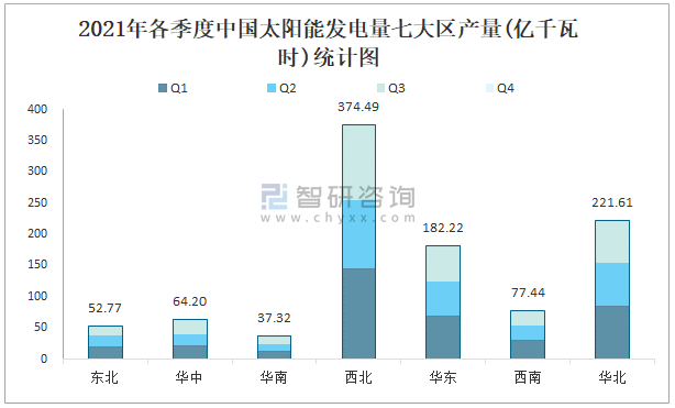 根据国家统计局数据显示:2021年各季度(第三季度目前暂只统计7月和8月数据)中国太阳能发电量主要集中在西北、华北、华东地区生产;2021年1-8月中国太阳能发电量产量大区分布不均衡,其中西北地区产量最高,特别是青海省贡献了最多产量;2021年1-8月中国太阳能发电量各省市产量呈现梯队式分布,青海、新疆、内蒙古等省产量最多。