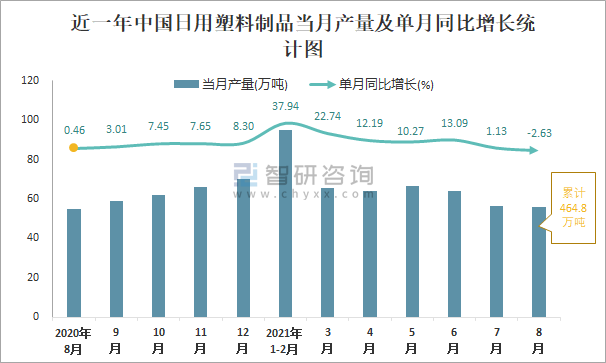 根据国家统计局数据显示:2021年8月中国日用塑料制品产量为56.1万吨,同比下降2.63%;2021年1-8月中国日用塑料制品累计产量为464.8万吨,同比增长18.57%;2015-2020年中国日用塑料制品产量2018年跌至最低,此后逐年递增。