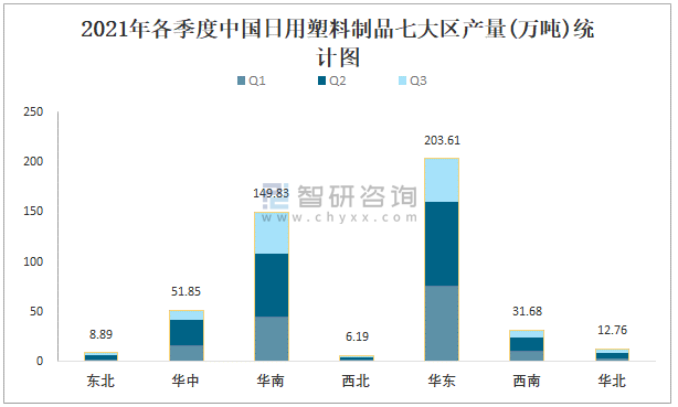 根据国家统计局数据显示:2021年各季度(第三季度目前暂只统计7月和8月数据)中国日用塑料制品主要集中在华东、华南、华中地区生产;2021年1-8月中国日用塑料制品产量大区分布不均衡,其中华东地区产量最高,特别是浙江省贡献了最多产量;2021年1-8月中国日用塑料制品各省产量top1遥遥领先于其他前9名。