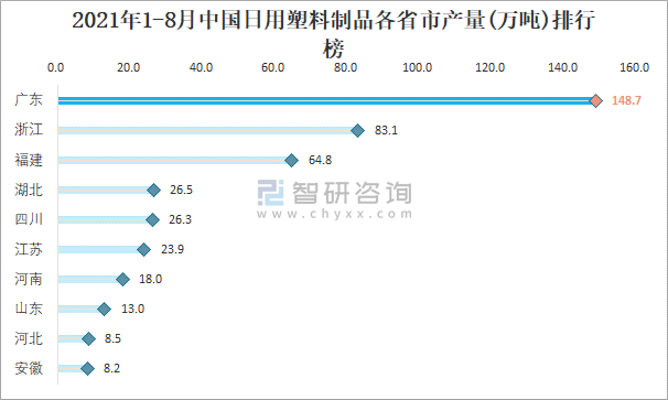 2021年1-8月中国日用塑料制品各省市产量排行榜