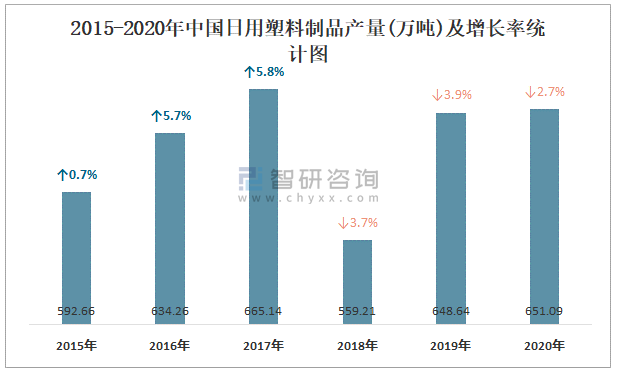 2015-2020年中国日用塑料制品产量及增长率统计图