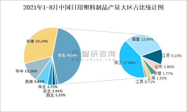 2021年1-8月中国日用塑料制品产量大区占比统计图