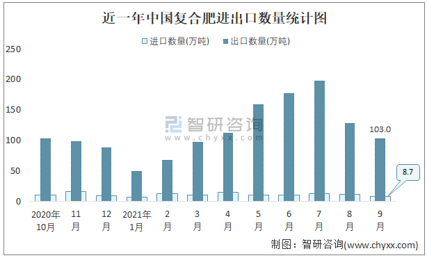 根据中国石油和化学工业联合会数据显示:2021年9月中国复合肥进口数量为8.7万吨,出口数量为103万吨;进口金额为5611万美元,出口金额为58305万美元;近一年中国复合肥出口总金额大于进口总金额,贸易顺差为主,出口均价566美元/吨。