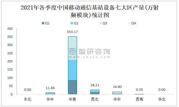 2021年各季度中国移动通信基站设备七大区产量统计图