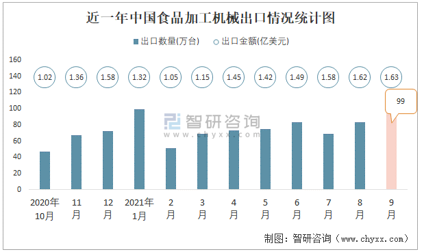 近一年中国食品加工机械出口情况统计图