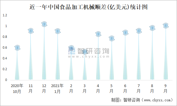 近一年中国食品加工机械顺差(亿美元)统计图
