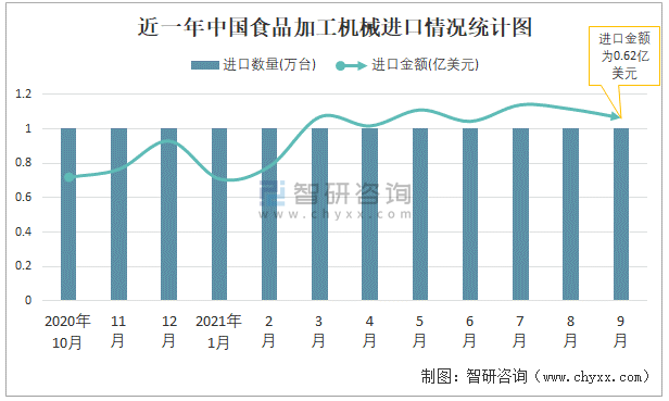 根据中国海关数据显示:2021年9月中国食品加工机械进口数量为1万台,同比增长55.1%,进口金额为0.62亿美元,同比增长25.3%,2021年9月中国食品加工机械出口数量为99万台,同比增长61.2%,出口金额为1.63亿美元,同比增长35.4%;2021年1-9月中国食品加工机械进口数量为11万台,进口金额为5.3亿美元,出口数量为670万台,出口金额为12.7亿美元。