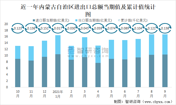 近一年内蒙古自治区进出口总额当期值及累计值统计图