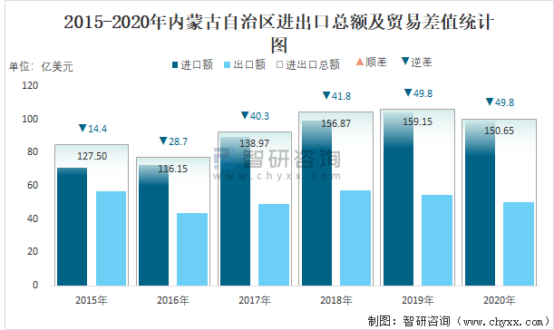 2015-2020年内蒙古自治区进出口总额及贸易差值统计图