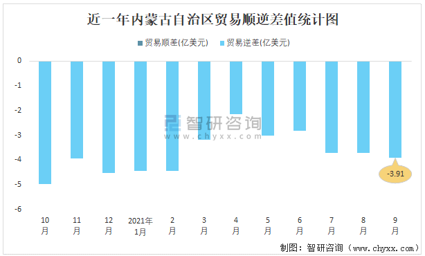 近一年内蒙古自治区进出口每月均呈现贸易逆差状态,其差值在2021年4月跌至最低值,此后总体呈现上升趋势,2021年9月内蒙古自治区进出口贸易差值为3.91亿美元。2021年9月内蒙古自治区进出口总额占全国比重为0.31%,相较于其他类型的企业,其中内蒙古自治区外商投资企业进出口总额占进出口总额比重为7.4%。